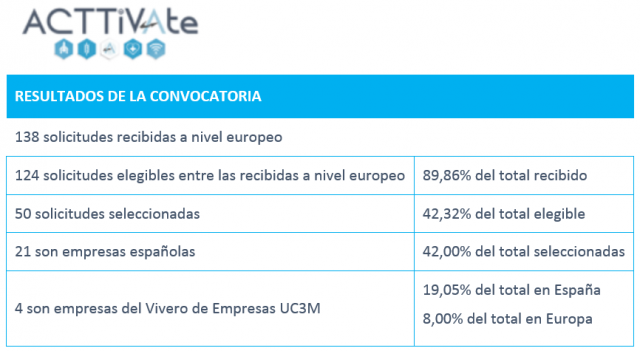 En la Comunidad de Madrid, el responsable de dinamizar la primera edición de ACTTiVAte ha sido el Cluster Aeroespacial, en el que participa la UC3M. Del total de empresas seleccionadas destaca el número de PYMES nacionales como las citadas, que desarrollan su innovación en el ecosistema emprendedor e innovador de la Universidad.
