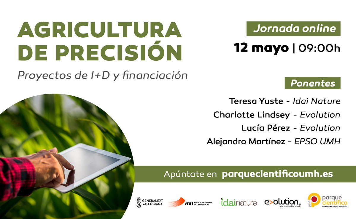 Dar a conocer los principales proyectos de I+D+i que se están llevando a cabo en la actualidad, favorecer el intercambio de conocimiento público privado y dar a conocer diferentes líneas de financiación que permitan que los proyectos se ejecuten con éxito. Este es el objetivo del desayuno que ha organizado el Parque Científico de la Universidad Miguel Hernández (PCUMH) de Elche el próximo martes, 12 de mayo. Expertos en agricultura, proyectos de I+D y financiación serán los encargados de impartir este webinar, dividido en tres formaciones, que estará disponible entre las 9:00 y las 19:00 horas a través de una plataforma online. Un día antes del evento, los inscritos recibirán un email con las instrucciones para acceder a las tres formaciones. Esta jornada es gratuita y está abierta al público en general previa inscripción en parquecientificoumh.es/es/agricultura-de-precision-proyectos-de-id-y-financiacion
