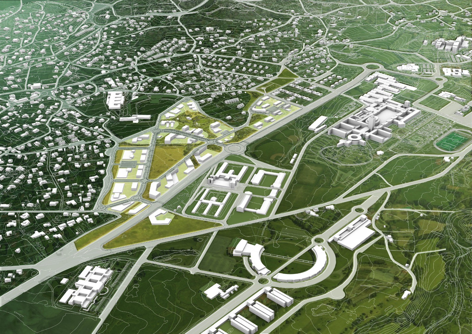 En la ordenación destaca, en el corazón del futuro PCTG, un centro de servicios que estará dedicado a actividades terciarias y donde tendrían cabida desde restaurantes a cines. En el apartado de equipamientos se incluye una escuela pública infantil. Y las zonas verdes ocuparán 76.000 metros cuadrados, que se repartirán principalmente entre los jardines de la Quinta del Duque (que mantendrá sus elementos principales) y una gran ágora central que incluirá una balsa de laminación como parte de un sistema de drenaje sostenible que optimizará el aprovechamiento de las aguas pluviales, que tendrán una red independiente a la de las fecales.