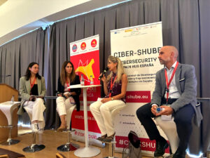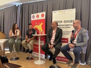 Foto segunda mesa. De izquierda a derecha: Elena García Mendoza (coordinadora de Proyectos y Redes de APTE), Diego Tuccillo (Deduce Data Solutions), Francisco Luis Benítez Martínez (FIDESOL) y Horacio J. Jávega (HardLink Security).