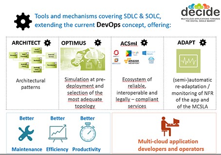 “DECIDE amplía el concepto actual de DevOps a la fase arquitectónica y facilita el funcionamiento de aplicaciones multi-cloud complejas con la provisión de herramientas que dan soporte a desarrolladores y administradores en el ciclo de vida completo de la aplicación, desde su diseño a su explotación”.