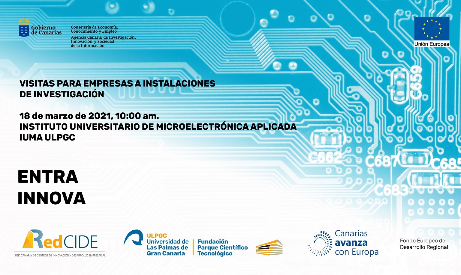 El próximo día 18 de marzo de 2021, en horario de 11:00 a 12:30 (en horario de 10:00 a 11:30 en horario canario), tendrá lugar el tercer evento online "ENTRA, INNOVA: visitas para empresas a instalaciones de investigación", organizado por el centro CIDE de la Fundación Canaria Parque Científico Tecnológico de la ULPGC y la Universidad de Las Palmas de Gran Canaria. En este evento, dirigido a empresas y personas interesadas, realizaremos una visita virtual a las instalaciones de investigación del IUMA – Instituto Universitario de Microlectrónica Aplicada, donde nos contarán las capacidades, equipos, proyectos de investigación desarrollados en la actualidad.