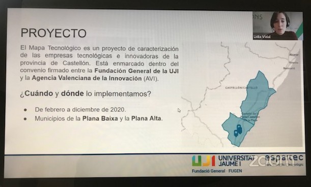 El primero de los proyectos presentados, fue el «Mapa Tecnológico de la provincia de Castellón» a cargo de Lidia Vidal, técnica del proyecto. Durante la exposición, se subrayó que se contactó con 473 empresas de la provincia de Castellón, de las que 113 finalmente han participado en el proyecto hasta la fecha, el cual tiene un carácter de constante evolución y desarrollo. El proyecto ha permitido identificar y dar visibilidad a las empresas de base tecnológica e innovadora de la provincia, así como explorar las posibilidades de sinergias y colaboraciones entre ellas. Se pueden observar los resultados del proyecto en http://mapatecnologico.uji.es/