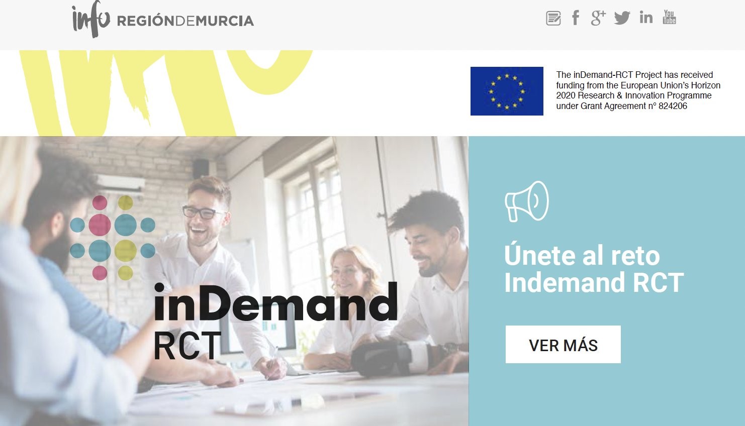 Es un proyecto financiado por la UE en el marco del programa marco de investigación e innovación Horizonte y liderado por INFO que llevará a cabo un Ensayo de Control Aleatorio o Random Control Trials (RCT) para comprobar la eficacia de un nuevo modelo de apoyo a la innovación (Modelo inDemand, innovación impulsada por la demanda) para las PYMES que se aplicará para dar respuesta a las necesidades de I +D, la digitalización y la respuesta a Covid19 identificadas por las GRANDES EMPRESAS de la región de Murcia, comparando los retos de estas empresas con el apoyo inDemand (co-creación + apoyo empresarial) frente a la investigación de las PYMES cuya respuesta a las necesidades identificadas, se realice sin ese apoyo. Se hará en la región de Murcia pero los resultados se difundirán ampliamente a otras regiones de Europa.