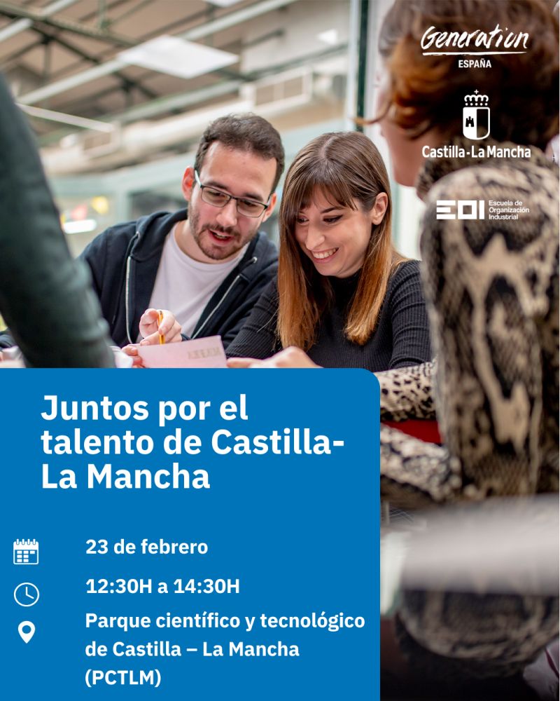 📍Fundación GenerationEspaña y el Gobierno de Castilla-La Mancha de organizan, el próximo 23 de febrero, un evento en el Parque Científico y Tecnológico de Castilla-La Mancha orientado a fortalecer la competitividad empresarial y a favorecer la incorporación de talento joven preparado.