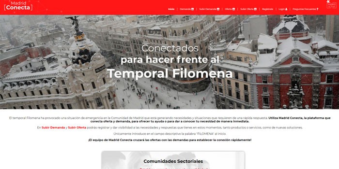 La llegada del temporal Filomena ha provocado una situación de emergencia en la Comunidad de Madrid que ha generado necesidades y situaciones que requieren de una rápida respuesta. Por este motivo, en la plataforma se han creado dos espacios específicos ante la borrasca Filomena, por un lado, uno para conectar empresas de maquinaria con clientes como grandes plataformas, municipios o comunidades de vecinos; y otro enfocado a que cualquier distribuidora que disponga de palas o herramientas útiles para despejar accesos pueda ponerlo a disposición de todos los que puedan necesitarlo.