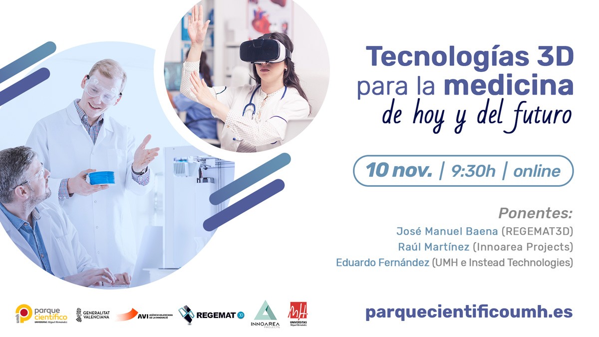 “Tecnologías 3D para la medicina de hoy y del futuro” es el título de la jornada online que ha organizado el Parque Científico de la Universidad Miguel Hernández (PCUMH) de Elche el martes 10 de noviembre. El objetivo de esta sesión es dar a conocer las posibilidades y aplicaciones de nuevas tecnologías innovadoras como la impresión 3D o la Realidad Virtual en el sector Salud. También se busca impulsar el intercambio de conocimiento entre la universidad y la empresa. Expertos en este ámbito serán los encargados de impartir la jornada, que tendrá lugar entre las 9:30 y las 12:00 horas. La asistencia es gratuita y está abierta al público en general, previa inscripción aquí.
