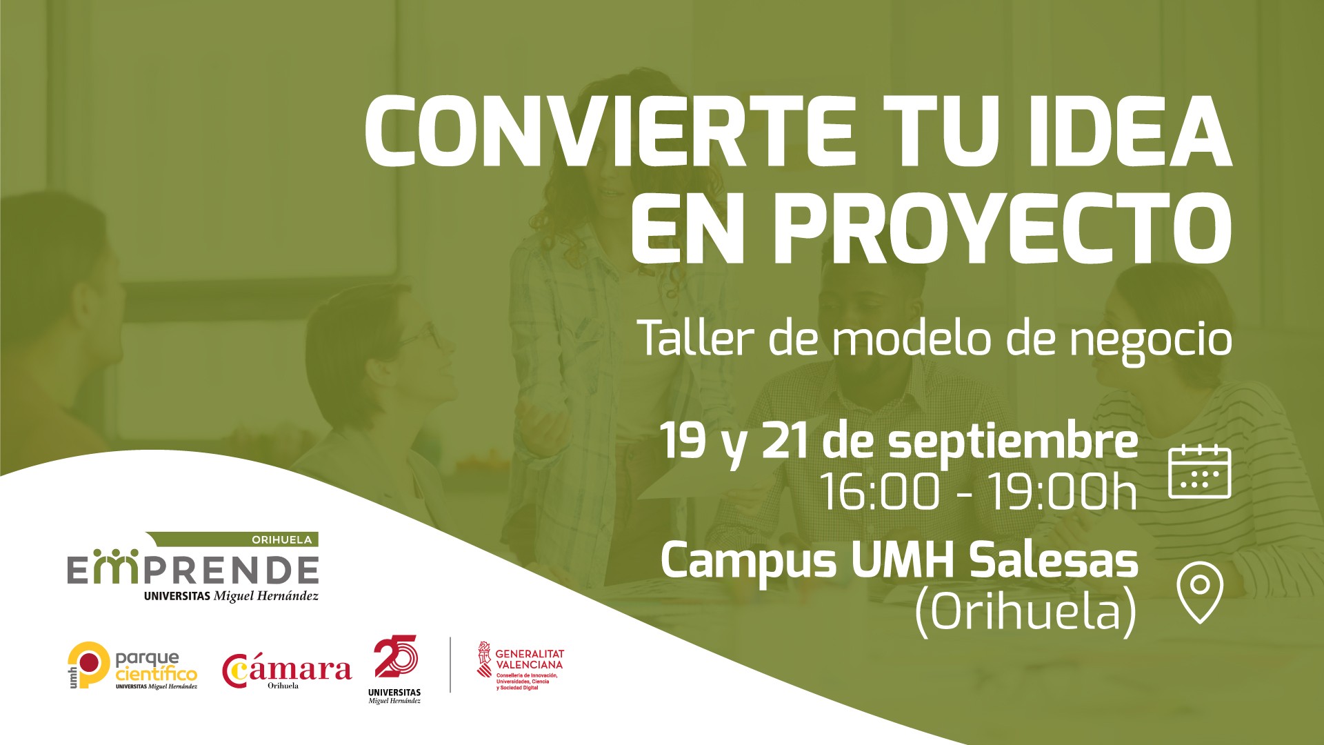 Dar la oportunidad a emprendedores y start-ups de reciente creación de trabajar con mentores expertos en la generación de nuevas ideas, y en la definición y validación de su modelo de negocio. Este es el objetivo del taller que ha organizado el Parque Científico de la Universidad Miguel Hernández (PCUMH) de Elche en el marco de la cuarta edición del programa Orihuela Emprende. Esta jornada, que se dividirá en dos sesiones, se realizará el próximo lunes, 19 de septiembre, y el miércoles 21 de septiembre en el Aula 1.1.A del Edificio Casa del Paso, ubicado en el campus de la UMH en Orihuela Salesas. La participación en el evento, que comenzará a las 16:00 horas, es gratuita previa inscripción en www.parquecientificoumh.es/es/convierte-tu-idea-en-proyecto-orihuela-emprende
