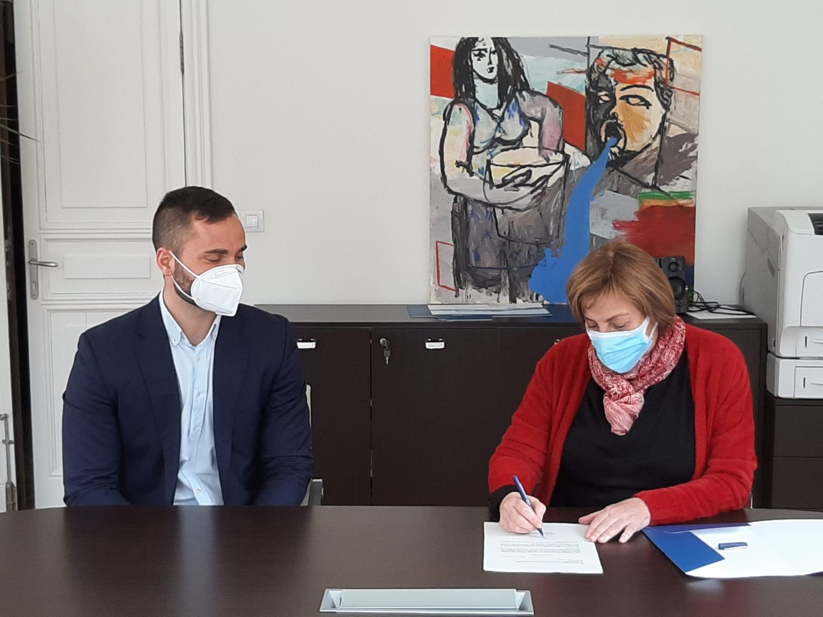 Foto: Alberto Sánchez, gerente de CETAQUA Galicia y Mariví Monteserín, presidenta del PCT Avilés isla de la Innovación, rubricando la adhesión de Avilés a la red HOOP