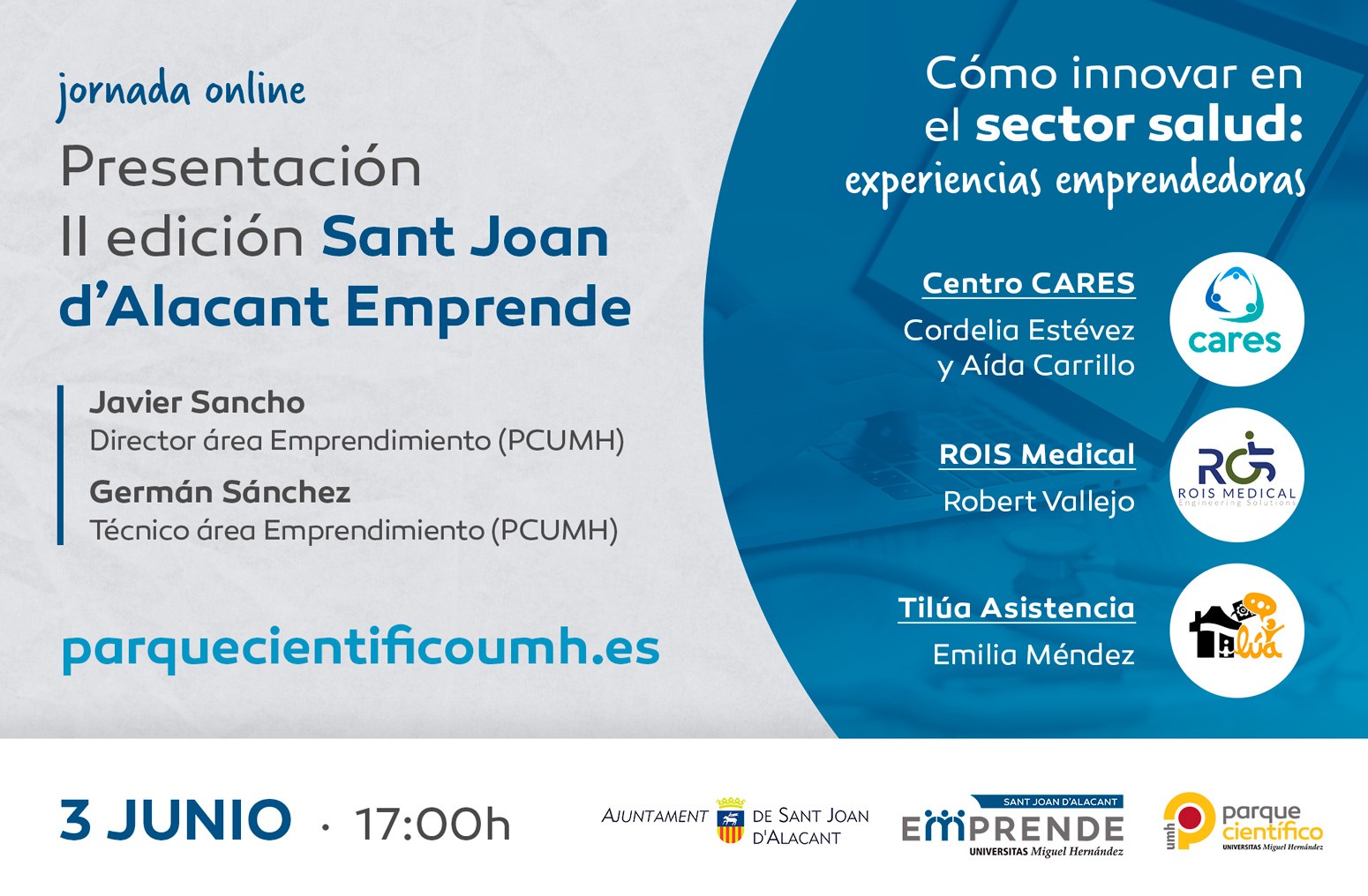 Dar a conocer todos los detalles de la 2ª edición del programa Sant Joan Emprende, así como mostrar las claves para innovar y emprender en el sector Salud de la mano de diversas start-ups de ámbito sanitario. Estos son los objetivos de la jornada online que ha organizado el Parque Científico de la Universidad Miguel Hernández (PCUMH) de Elche el próximo miércoles, 3 de junio. Expertos y emprendedores del PCUMH serán los encargados de impartir este webinar, que se llevará a cabo de las 17:00 y las 18:15 horas a través de una plataforma online. Un día antes del evento, los inscritos recibirán un email con las instrucciones para acceder a la sesión. Esta jornada es gratuita y está abierta al público en general previa inscripción.