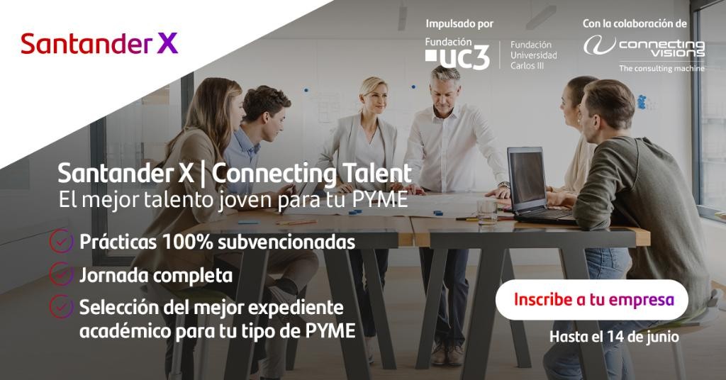 La Fundación Universidad Carlos III con el apoyo económico de Banco Santander, S.A., ha desarrollado el Programa de “Becas Santander Prácticas | Connecting Talent” con el objetivo de ofrecer la oportunidad a los jóvenes de mejorar su empleabilidad, y desarrollarse profesionalmente en el mercado laboral, así como proporcionar a pequeñas y medianas empresas acceso a nuevo talento, ayudando así a desarrollar una estrategia de responsabilidad para con la sociedad.