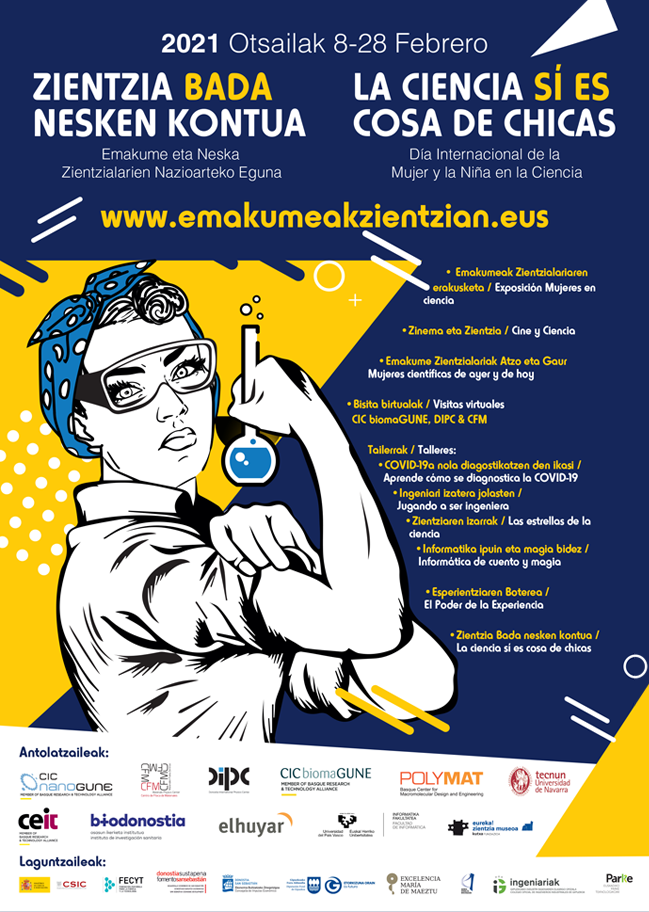 Para conmemorar el Día Internacional de la Mujer y la Niña en la Ciencia, la Red de Parques Tecnológicos de Euskadi en Gipuzkoa, se ha sumado a esta iniciativa mundial apoyando a centros y entidades como Donostia International Physics Center (DIPC), CIC nanoGUNE, el Centro de Física de Materiales CFM (UPV/EHU-CSIC), CIC biomaGUNE, Biodonostia, Tecnun-Escuela de Ingenieros, CEIT, Polymat y Elhuyar, la Facultad de Informática de la UPV/EHU y Eureka! Zientzia Museoa. Gracias a la unión de fuerzas se pudo presentar un programa completo de actividades dirigidas a todos los públicos.