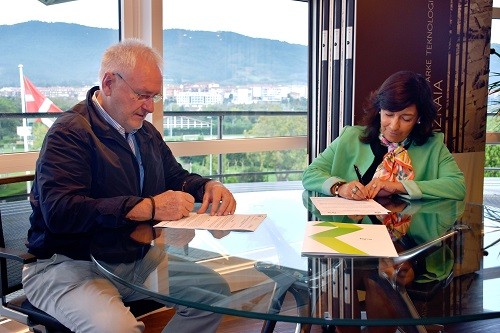 Itziar Epalza, directora general de la Red de Parques Tecnológicos de Euskadi, y Jon Mancisidor, presidente de EDE Fundazioa, han rubricado el acuerdo