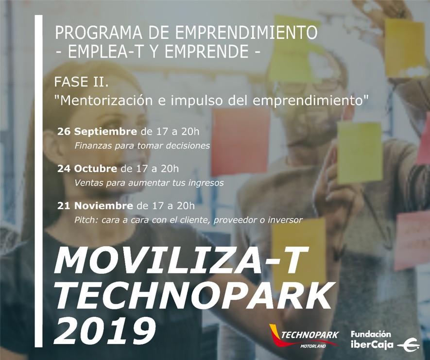 TechnoPark MotorLand y Fundación Ibercaja lanzan la segunda fase de su programa “Moviliza-T TechnoPark 2019”, centrada en la mentorización y en el impulso del emprendimiento. De esta forma, en los próximos meses de septiembre, octubre y noviembre van a desarrollarse tres nuevas jornadas formativas gratuitas que ofrecerán a los participantes los conocimientos y herramientas necesarias para conocer la situación económica de su empresa y hacerla crecer vendiendo mejor.